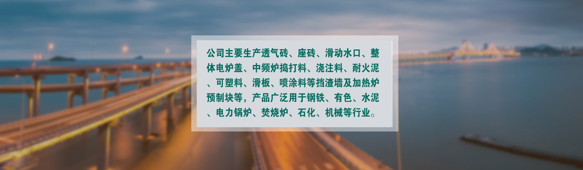 公司主要生產(chǎn)滑板、上下水口、滑動(dòng)水口、鋼包座磚、透氣磚、座磚、整體電爐蓋、擋渣墻及加熱爐預(yù)制塊等;不定形產(chǎn)品主要生產(chǎn)中頻爐搗打料、澆注料、耐火泥等。